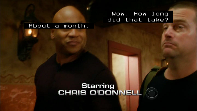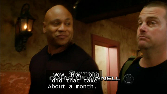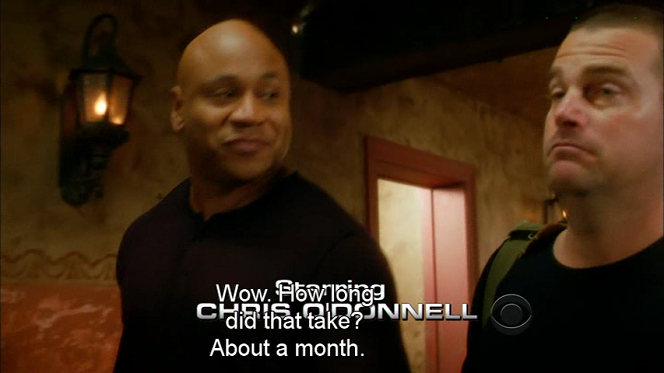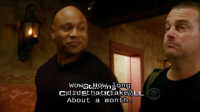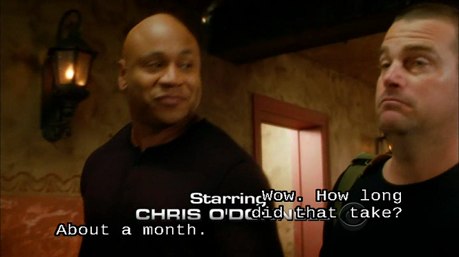 A picture is worth a thousand words. So here are some screenshots that show how the same caption in the same scene is displayed depending on the ccextractor output format, how an application displays the caption, and how the user configures the application to display the caption. The scene in question has two people engaged in conversation, the caption captures what both people are saying, and it is near the beginning of the show, so credits are displayed near the bottom of the scene.